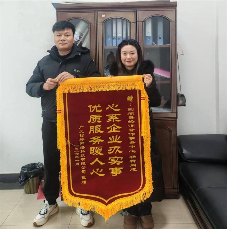 广元松籽网络科技有限公司负责人送来锦旗。徐文峰供图近日,四川剑阁县外资企业广元松籽网络科技有限公司负责人专程来到县经济合作事务中心,送上一面印有“扶纾企困、高效服务”的锦旗,表达对中心在企业落地、运营全过程中提供精准高效服务、协助解决实际困难的诚挚感谢。这面锦旗不仅是企业认可的具体体现,更是剑阁县持续优化营商环境、全力服务经营主体的生动写照。